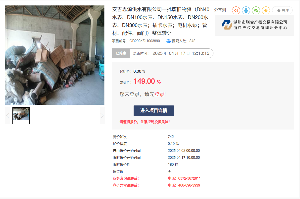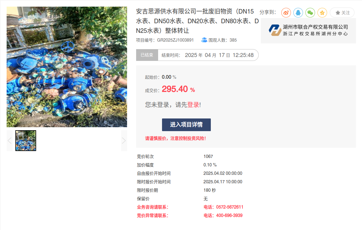 4月17日,安吉思源供水有限公司兩批次廢舊物資通過“浙交匯”平臺,以“上浮率動態(tài)報價”競價模式實現(xiàn)高溢價成交。兩宗標(biāo)的分別歷經(jīng)742、1067輪激烈競價,以149%、295.4%溢價率成功轉(zhuǎn)讓。